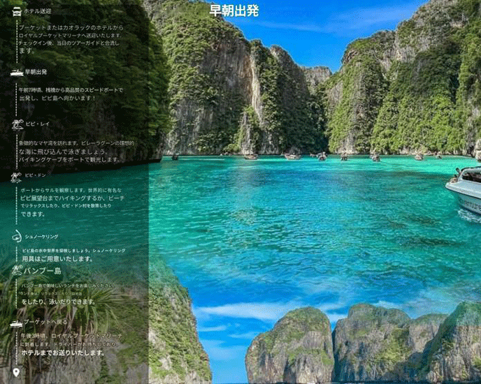 このツアーは、朝5時頃お泊りのホテルにお迎えに伺い(ホテルの地区により異なります)、7時頃マリーナを出発するツアーです。混雑していないピピ島のマヤベイに上陸することが出来ます。ホテルお戻りは17時前になります(地区により異なります)。