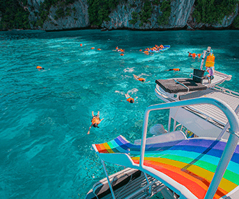 このツアーでは、午前中にマヤベイ、ピレイラグーン、バイキングケーブを訪れます。途中ピレイラグーンでロングテールボート、シュノーケルをお楽しみ頂けます。ランチ後はモンキービーチ付近でシュノーケルを楽しんだ後、透明度抜群のマイトン島沖でシュノーケルをして、サンセットの中帰港します。(8~9月はマヤベイが上陸禁止になるため、シュノーケルを代わりに行います)