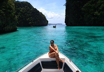 ピピ島ピレィラグーンでのロングテールボート上の撮影30分ほど。乗合の場合は30分の中で交代で撮影します。カメラマンは付いていません。